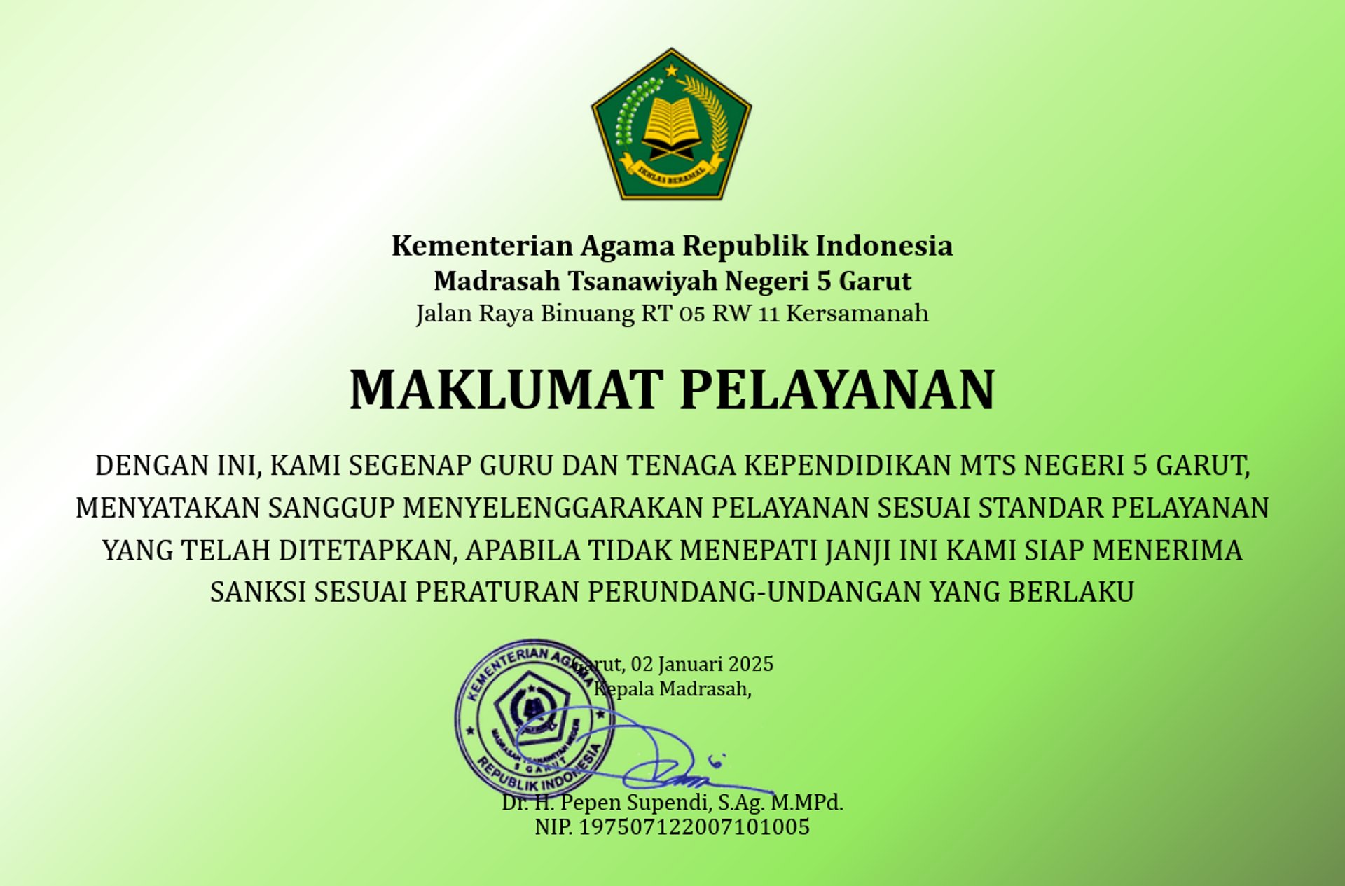 Madrasah Tsanawiyah Negeri 5 Garut | MTsN 5 Garut - HADE ( Humanis - Agamis - Dedikasi - Elegan )