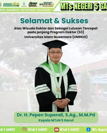 "Selamat & Sukses atas Wisuda Doktor dan Penghargaan sebagai Lulusan Tercepat pada jenjang Program Doktor (S3) UNINUS kepada Bapak Dr. H. Pepen Supendi, S.Ag., M.M.Pd. Semoga gelar dan ilmu yang diraih menjadi berkah bagi diri, keluarga, dan kemajuan MTsN 5 Garut serta dunia pendidikan Islam di Indonesia."