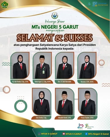 GARUT β Suasana khidmat dan penuh rasa bangga menyelimuti keluarga besar Madrasah Tsanawiyah Negeri (MTsN) 5 Garut. Kabar membahagiakan datang dari jajaran tenaga pendidik, di mana tujuh orang guru terbaik madrasah secara resmi dianugerahi penghargaan kehormatan Satyalancana Karya Satya oleh Presiden Republik Indonesia.